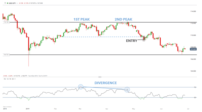 上图为美元/日元周线图。双顶形态是在先前的上升趋势之后形成的,第一个峰值达到阻力高位,同时RSI 振荡器突出显示超买信号。从这个峰值之后,市场强度下降,形成两个峰值之间的特征性下跌。第二个峰值随后发展得比前一个峰值稍强,甚至一度突破了阻力位。有趣的是,RSI 在突破阻力位时并未显示突破/超买信号(如突出显示) 。这证实了两个“顶部”之间的市场价格之间的背离以及 RSI 振荡器显示动能放缓的情况。此外,这种性质的背离表明了看跌信号。