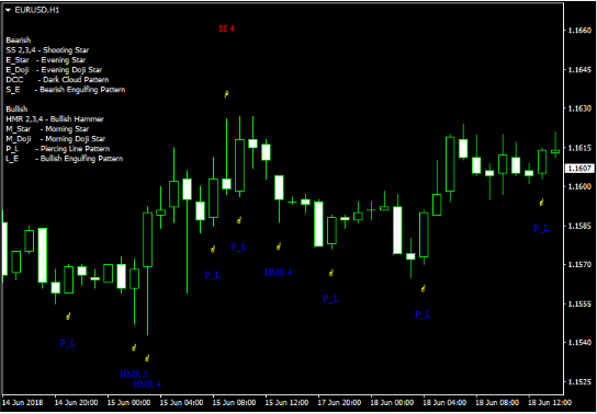 首先,您应该理解该指标仅能暗示形态。您会在蜡烛台附近看到这些符号,还会在屏幕左上角看到这些符号的图例。第二,您需要知道这些形态有什么作用,何时是空头头寸的信号,何时是多头头寸的信号。对于经验丰富的日本蜡烛台形态的交易商来说,该指标是一种非常有用的工具,但对于其他交易商来说,可能毫无用处。