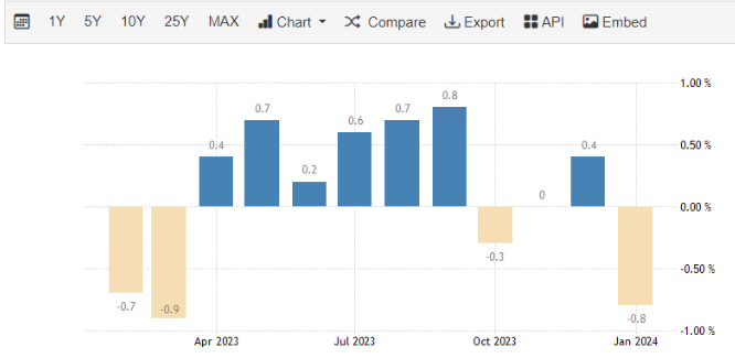 昨天美国零售销售数据令市场失望,转为负数,且大幅低于市场预期。1月份的数据0f -0.8%是近一年来的最低读数,而前两个月的数据也被下调。1 月份零售销售下降 0.8%,12 月份数据从 0.6% 修正为 0.4%,11 月份销售数据从初值 0.3% 修正为 0%。